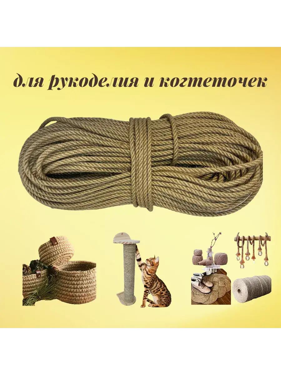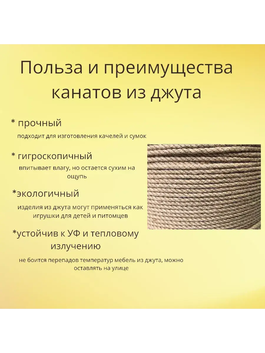 Отлично подходит для рукоделия, изготовления когтеточек. Когтеточка из джута порадует вашу кошку. Хорош в качестве аксессуара для рукоделия, если хочется сделать корзинки из джута. В декоре джутовый канат 6 мм используют для перил, сервировочных салфеток . Джут имеет удивительное свойство "дышать", пропитан натуральной смолой и поэтому не впитывает влагу. Коврик из джута украсит санузел, а плэйсмат из джута украсит ваш стол. Это все можно сделать, если у вас дома есть джутовая веревка. Натуральный оттенок джутовой веревки сочетается с аксессуарами в стиле эко. Часто джутовый шнур используют как межвенцовый утеплитель. Джутовая пряжа вам пригодится, если надумаете связать кашпо для цветов, корзины для белья.
