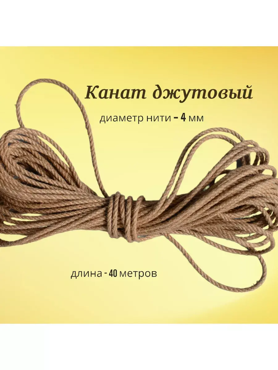 Джутовый канат широко используется для декора интерьера, создания поделок, незаменимый в быту. Изготовлен из натурального сырья растительного происхождения. Веревка джутовая обладает высокой прочностью, устойчива к истиранию, негативному воздействию ультрафиолета и резкому перепаду температур. Она мягкая, имеет равномерную витую структуру без посторонних включений, не ворсится и не колется. Шпагат применятся для создания предметов интерьера: кресел, абажуров, кашпо, вязания ковриков, корзин, отлично подходит для изготовления когтеточек. Также веревка используется в приусадебном хозяйстве, в быту, на строительных площадках и в производстве. Джут вымачивают в специальном растворе для глубокого расщепления волокна, придания ему мягкости и прочности. Именно поэтому, при полном соблюдении технологии обработки и производства джутового волокна, шпагаты и веревки, изготовленные из него, имеют специфический запах, который постепенно выветривается. Длина веревки - 40 м, диаметр нити - 4 мм. Джутовый шпагат - ваш верный помощник в самых разнообразных делах.