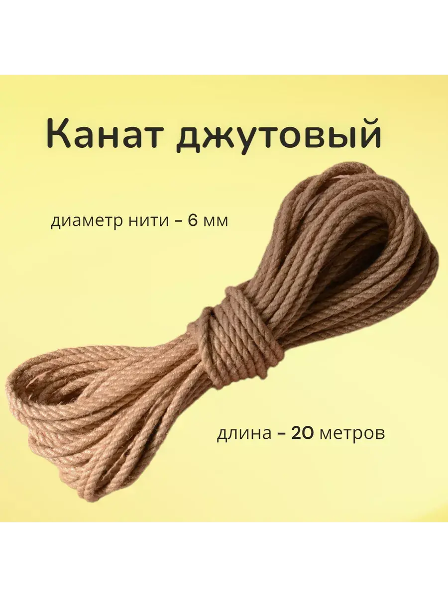 Канат джутовый 6 мм длиной 20 метров. Состав: джутовая нить натуральная. Отлично подходит для рукоделия, изготовления когтеточек. Когтеточка из джута порадует вашу кошку. Хорош в качестве аксессуара для рукоделия, если хочется сделать корзинки из джута. В декоре джутовый канат используют для перил, сервировочных салфеток . Джут имеет удивительное свойство "дышать", пропитан натуральной смолой и поэтому не впитывает влагу. Веревка из джута украсит санузел, а плэйсмат из джута украсит ваш стол. Это все можно сделать, если у вас дома есть джутовый канат. Натуральный оттенок джутовой веревки сочетается с аксессуарами в стиле эко. Часто джутовый шнур используют как межвенцовый утеплитель. Джутовая пряжа вам пригодится, если надумаете связать кашпо для цветов, корзины для белья. Чем так хорош джут для рукоделия? Гигроскопичностью. Этот материал впитывает и удерживает влагу внутри волокон, оставаясь сухим на ощупь. Прочностью. Изделия из джута чрезвычайно прочны на разрыв. Благодаря этому качеству, такую ткань используют для производства канатов. Минимальной степенью растяжимости. За счет плотности джут не подвержен деформированию. Воздухопроницаемостью. Благодаря этому качеству, в деревянном домостроении востребован межвенцовый джутовый утеплитель. Джутовая нить считается идеальным теплоизолятором. К плюсам этого материала стоит отнести и его красивую фактуру. При всех уникальных качествах джутовый шпагат отличается невысокой стоимостью. Рукодельничайте с джутом и приятных вам вечеров!