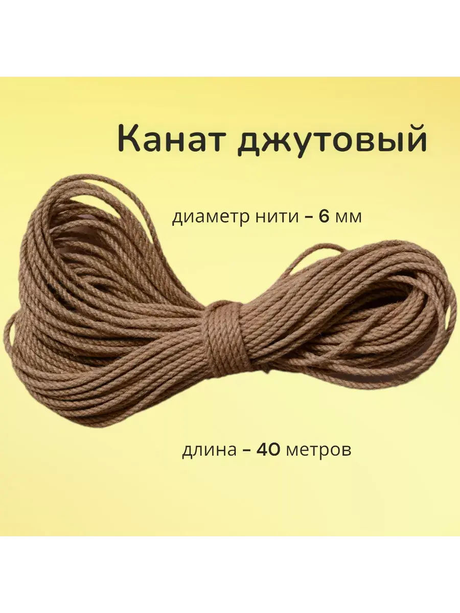 Канат джутовый 6 мм длиной 40 метров. Состав: джутовая нить натуральная. Отлично подходит для рукоделия, изготовления когтеточек. Когтеточка из джута порадует вашу кошку. Хорош в качестве аксессуара для рукоделия, корзинки из джута. В декоре джутовый канат 6 мм используют для перил, сервировочных салфеток . Джут имеет удивительное свойство "дышать", пропитан натуральной смолой и поэтому не впитывает влагу. Натуральный оттенок джутовой веревки сочетается с аксессуарами в стиле эко. Часто джутовый шнур используют как межвенцовый утеплитель. Джутовая пряжа вам пригодится, если надумаете связать кашпо для цветов, корзины для белья. Чем так хорош джут для рукоделия? Гигроскопичностью - материал впитывает и удерживает влагу внутри волокон, оставаясь сухим на ощупь. Прочностью - изделия из джута чрезвычайно прочны на разрыв. Благодаря этому качеству, такую ткань используют для производства канатов. Минимальной степенью растяжимости - за счет плотности джут не подвержен деформированию. Воздухопроницаемостью - благодаря этому качеству, в деревянном домостроении востребован межвенцовый джутовый утеплитель. Джутовая нить считается идеальным теплоизолятором. К плюсам этого материала стоит отнести и его красивую фактуру. При всех уникальных качествах джутовый шпагат отличается невысокой стоимостью. Рукодельничайте с джутом и приятных вам вечеров!