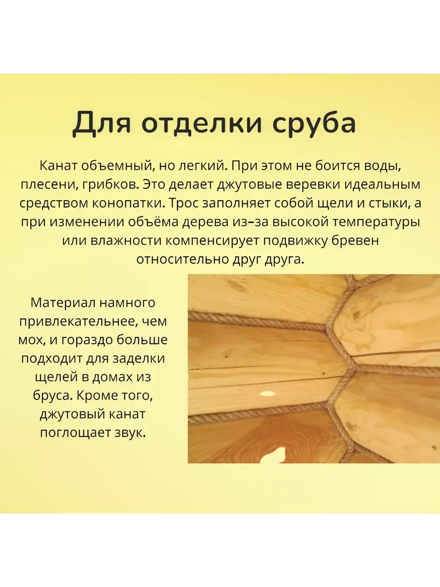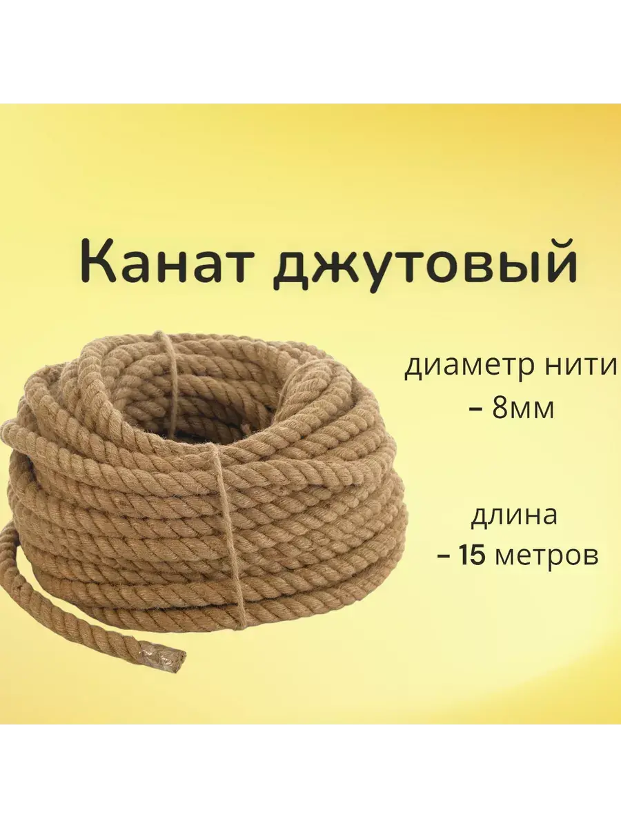 Джутовый канат широко используется для декора интерьера, создания поделок, незаменим в быту. Изготовлен из натурального сырья растительного происхождения. Канат джутовый обладает высокой прочностью, устойчив к истиранию, негативному воздействию ультрафиолета и резкому перепаду температур. Он мягкий, имеет равномерную витую структуру без посторонних включений, не ворсится и не колется. Канат применятся для создания предметов интерьера: кресел, абажуров, кашпо, вязания ковриков, корзин, отлично подходит для изготовления когтеточек. Также шпагат используется в приусадебном хозяйстве, в быту, на строительных площадках и в производстве. Джут вымачивают в специальном растворе для глубокого расщепления волокна, придания ему мягкости и прочности. Именно поэтому, при полном соблюдении технологии обработки и производства джутового волокна, шпагаты и веревки, изготовленные из него, имеют специфический запах, который постепенно выветривается. Длина шпагата джутового - 15 м, диаметр нити - 8 мм. Джутовый шпагат - ваш верный помощник в самых разнообразных делах. Этот многофункциональный материал находит применение в рукоделии, упаковке, хозяйственных нуждах и даже в кулинарии. Веревка джутовая для рукоделия - она подходит для вязания, создания украшений и декоративных элементов. С её помощью вы сможете придать вашим изделиям неповторимый натуральный шарм. Веревка джут для упаковки - джутовая веревка прекрасно дополняет подарки и подчеркивает экологичность вашего подхода к упаковке. Это стильное и экологически чистое решение. Шпагат хозяйственно-бытовой - в быту джутовый шпагат пригодится для самых разных задач – от подвешивания горшков с цветами до фиксации домашних принадлежностей.