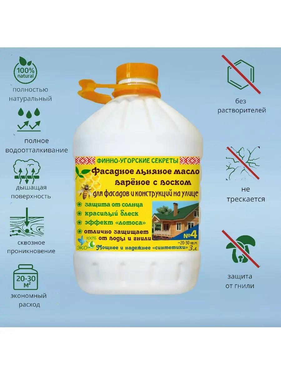 Льняное масло с воском №4 для неокрашенных поверхностей из дерева на улице - фасадов, террас, беседок, мебели, окон, дверей и т.д.Надежная защита от воды, солнца и гниения. Полный эффект "лотоса". Масло глубоко проникает в дерево, полимеризуется в нем и защищает изнутри, поэтому покрытие не трескается при изменении размеров дерева, не отшелушивается и служит долгие годы. Воск, за счет мощного водоотталкивания, предотвращает развитие грибка. Минералы защищают дерево от выгорания на солнечном свету. Антисептики обеспечивают усиленную защиту от гнили. БЛЕСК: Полуматовый, шелковистый (зависит от породы дерева и количества слоев). В жидком виде - соломенный, непрозрачный. После высыхания - прозрачное, слегка соломенное, проявляет рисунок дерева. Отлично колеруются в нужный цвет любыми универсальными колеровочными пастами.Фасадное льняное вареное масло с воском — идеальное решение для защитных деревянных поверхностей, как на фасадах зданий, так и на улицах, а также во внутренних помещениях. Это высококачественное масло создано специально для деревянных материалов, чтобы сохранить их естественную красоту и защитить от внешних воздействий. Наше фасадное льняное масло вареное с превосходными защитными механизмами. Благодаря содержанию воска он образует защитный слой на поверхности дерева, предотвращающий попадание влаги, грязи и УФ-лучей, которые могут вызвать разрушение и поблекшую окраску. Масло также глубоко проникает в структуру дерева, укрепляя его и предотвращая появление трещин и сколов.