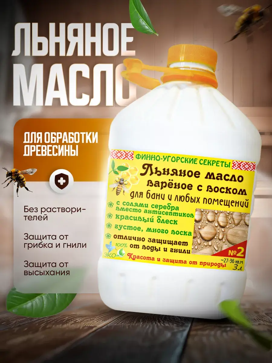 Льняное масло, варёное с воском для бани из дерева и любых помещений. Льняное масло по дереву - это универсальное средство для ухода и защиты деревянных поверхностей в бане.НЕ КОЛЕРУЕТСЯ! Бесцветное масло – пропитка для бани - идеально подходит для полков и особых уголков в банной комнате, придавая им естественный блеск и продлевая их срок службы. Наше льняное масло для древесины - для экологичной отделки и защиты стен, полков, мебели, полов в банях и любых помещениях. Это масло с воском для дерева отличается высоким качеством и незаменимо для бани. Оно не только защищает дерево от воздействия влаги и перепадов температур, но и придает ему ухоженный вид. Масло для дерева с воском - Защищает дерево от воды, грязи и грибка за счет мощного водоотталкивания поверхности и солей серебра в составе. Преимущества относительно традиционных покрытий: 1). Все компоненты природного происхождения.; 2). Легко обновляется без удаления старого покрытия; 3). Самое мощное водоотталкивание и защита от грязи; 4). Глубоко проникает в дерево, укрепляет и защищает изнутри. Масло воск для дерева в бане имеет приятный нейтральный запах и не оставляет липкости после нанесения. Специальная формула масла для бани и сауны обеспечивает глубокое проникновение в поры дерева, укрепляя его и создавая надежную защитную пленку. Таким образом, вы можете быть уверены в долговечности и сохранности вашей бани. Обратите внимание, что масло по дереву для полков в бане является основой для устойчивого и долговечного покрытия. Инструмент промыть водой с мылом. Меры безопасности: работать рекомендуется в резиновых перчатках, хорошо проветривать помещение. Не наносить лицам с аллергией на натуральные масла и продукты пчеловодства! Загрязненную ткань и инструмент промыть водой с мылом или хранить во влажном виде в несгораемой емкости во избежание самовоспламенения при сушке.