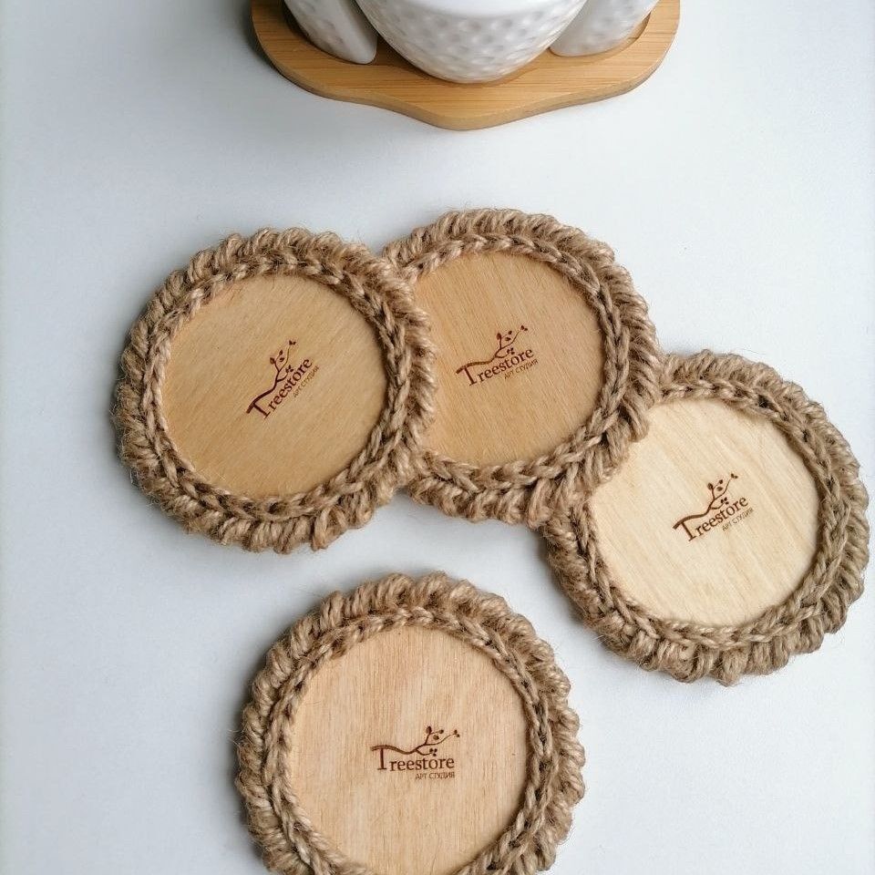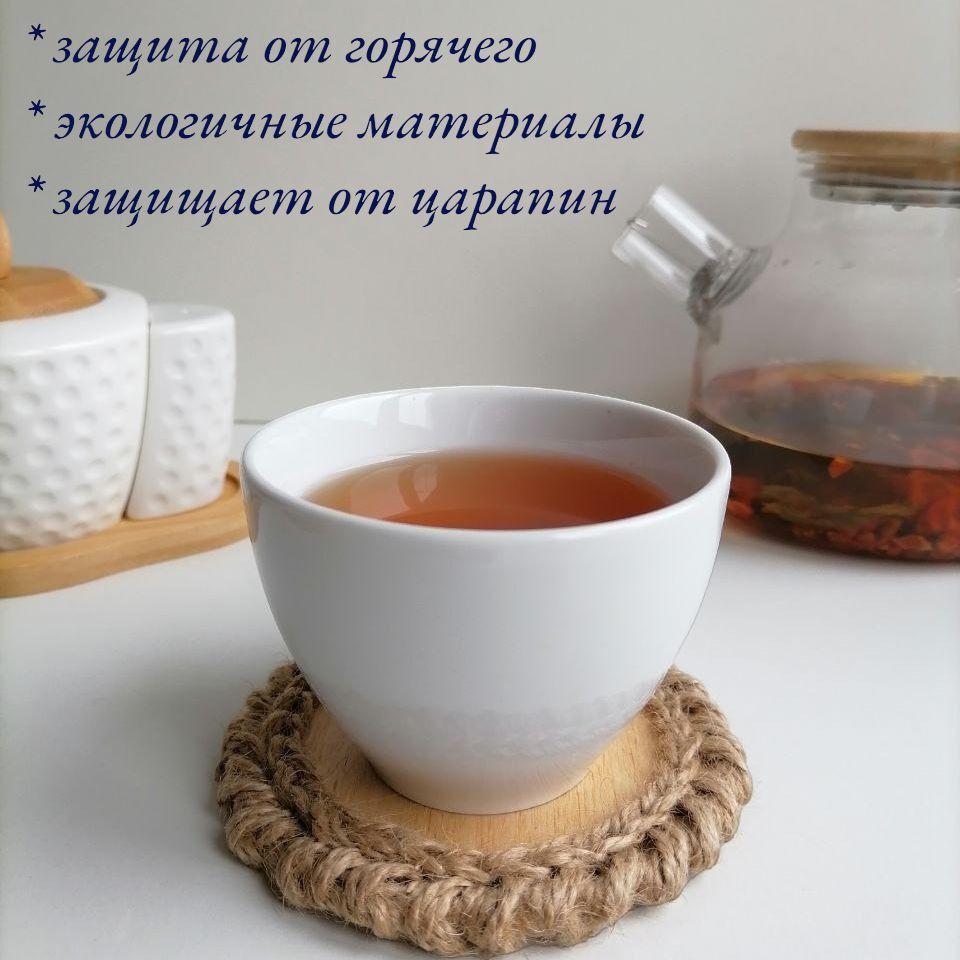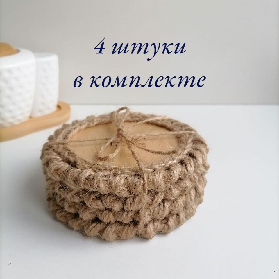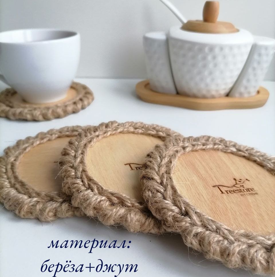 Подставка под горячее незаменимый атрибут для каждой хозяйки на кухне. Вязаный набор ручной работы выполнен из 100% натурального джутового волокна и натурального дерева, полностью экологичный материал, не боится влаги, безвредный для здоровья. Имеет влагоотталкивающие и антибактериальные свойства. Благодаря тому, что это довольно-таки прочный и износостойкий материал, этот набор длительное время не утратит свой первоначальный вид. Может использоваться для ежедневного декорирования и сервировки стола, как подставка под горячее, как декоративный элемент в гостиной, спальне; подставка, салфетка на стол, плетеная салфетка.