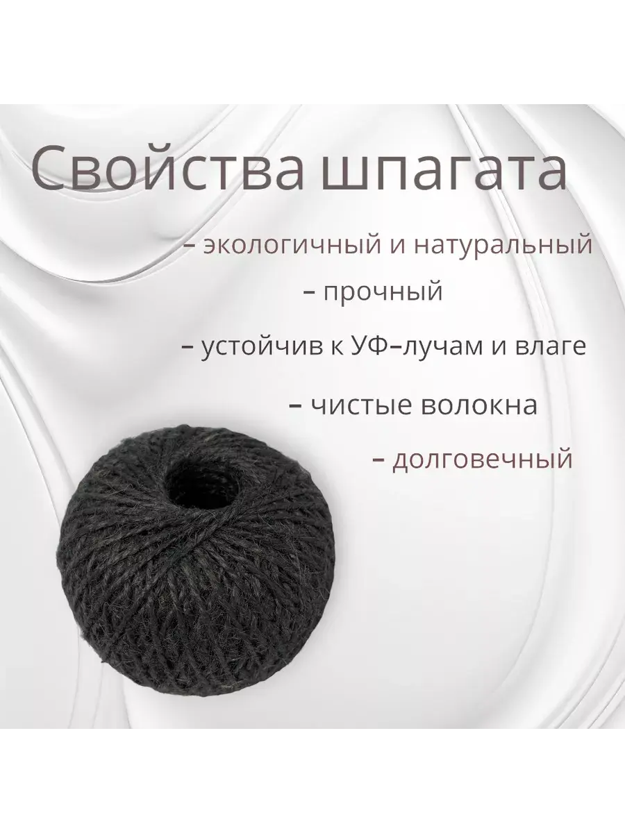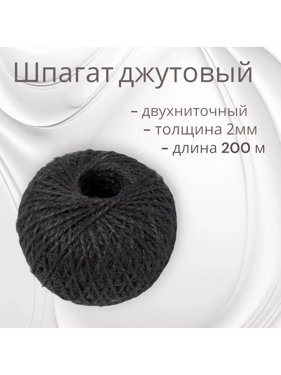 Шпагат джутовый, намотка 200 метров, 2х ниточный (двухниточный), толщина 2 мм 1120 текс ( две нити по 560). Бобина без резкого запаха, равномерная по всей длине. Шпагат черный для вязания крючком и плетения сумок, макраме, не ворсится, не пушится и не рвется. Идеально подходит для изготовления ковриков и ковров, кашпо корзин и корзинок, салфеток, гирлянд для фото. Тонкая декоративная двойная нить - отличный материал для изготовления изделий, например его можно использовать для поделок в школу, сад. Своими руками, с помощью джутового мотка получится прекрасная когтеточка кошке. Жгутовые нитки незаменимый помощник в декоре, творчестве, крафтовой упаковке подарков. Лента черная для торта поможет сделать упаковку Вашего десерта стильной, современной и оригинальной. Ленточка для шариков упаковочная станет помощником в организации праздников.