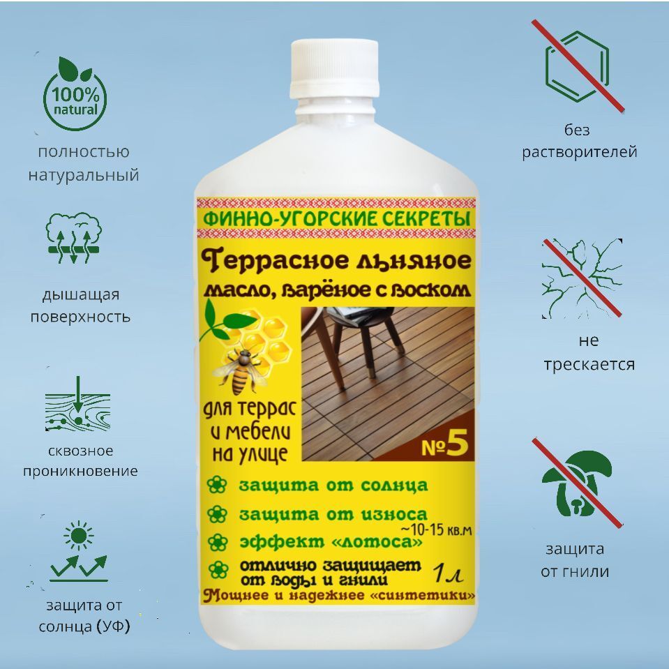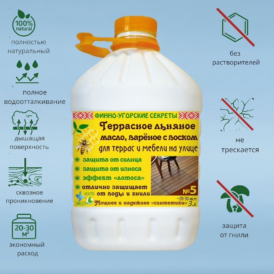 Сочетание льняного масла со вставками воска дают материалу долговечность и устойчивость к внешним факторам. Вы получите прекрасный эффект и защиту террас, перил, дверей и мебели из дерева. Наносится на любое неокрашенное или ранее окрашенное маслами дерево (для обновления). Защищает дерево от потемнения, воды, грязи, грибка и износа за счет мощного водоотталкивания поверхности, УФ-фильтра, антисептика, твердого воска и смол в составе.
