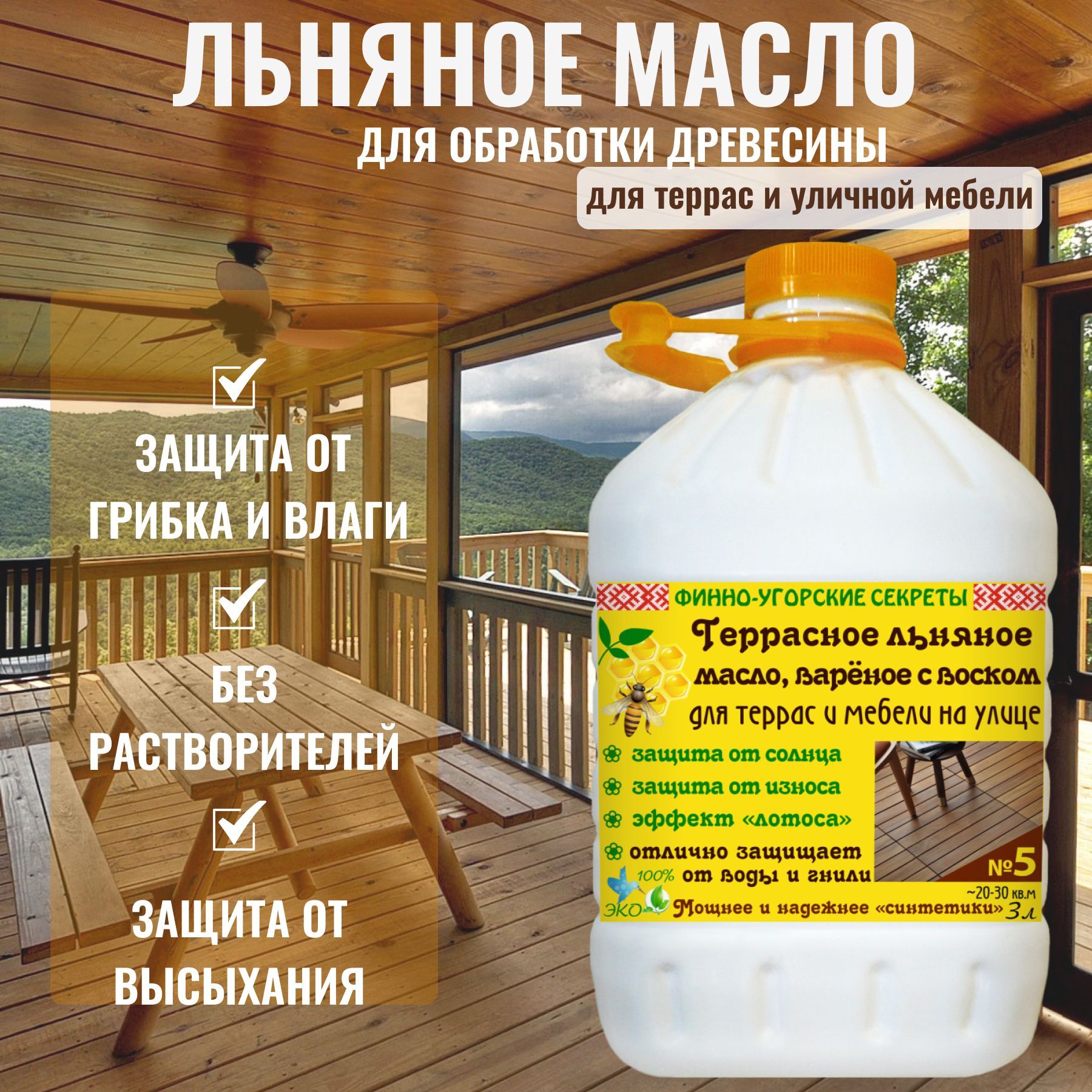 Мы предлагаем Вам - "Террасное льняное масло, вареное с воском", которое защитит дерево от потемнения, воды, грязи, грибка и износа. Этот продукт идеально подходит для тех, кто ценит натуральность и экологичность. Колеруется любыми колеровочными пастами для водных красок, пригодными для наружных работ (со светостойкостью 7-8 баллов), таким образом помогает создать идеальный образ террасы и достичь желаемого результата. После высыхания покрытие прозрачное, проявляет рисунок дерева. Без растворителей.